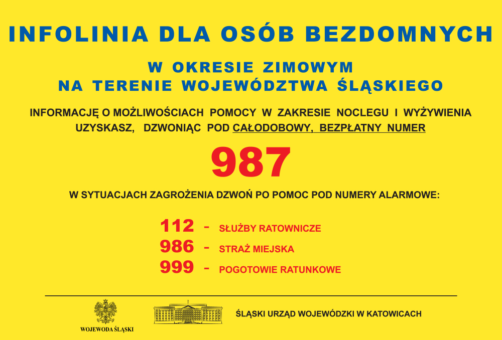 Wzorem lat ubiegłych w Śląskim Urzędzie Wojewódzkim w Katowicach z dniem 1 listopada br. uruchomiona zostanie całodobowa infolinia dla osób bezdomnych o bezpłatnym numerze telefonu 987.